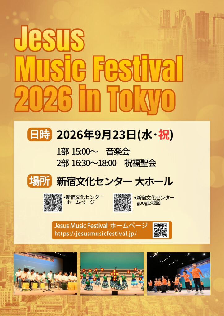 そして、第2回目となる「Jesus Music Festival 2026 in Tokyo」 が、東京都新宿区にある新宿文化センターで9月に開催されます。日本の中心地である東京にて、より多くの方々に福音の光が届くことを願い、開催いたします。多様な文化が行き交う都市・新宿で、世代や背景を超えて心をひとつにし、イエス・キリストの栄光を高らかに現す特別な一日となるよう、全国の教会が祈りと準備を重ねています。